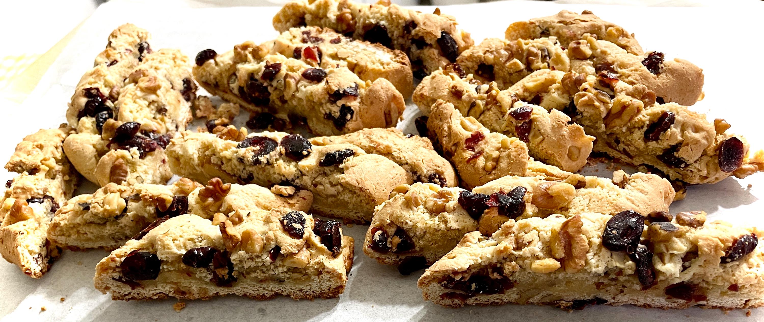 Over a pound per dozen. Biscotti. Filled with chunky, quality ingredients. No compromise on size of biscotti or amount of ingredients, unlike other biscotti. Baker picks the numbers of each type and assortment. Perfect for holiday gatherings and coffee breaks. Keeps you satisfied when you're on the go. An assortment of delicious biscotti with nuts or dried fruit or chocolate.