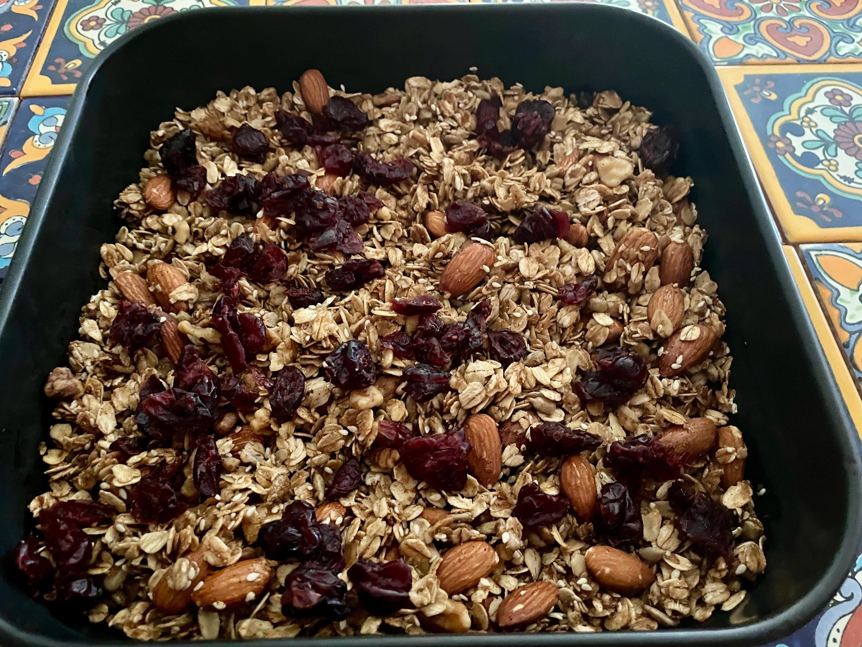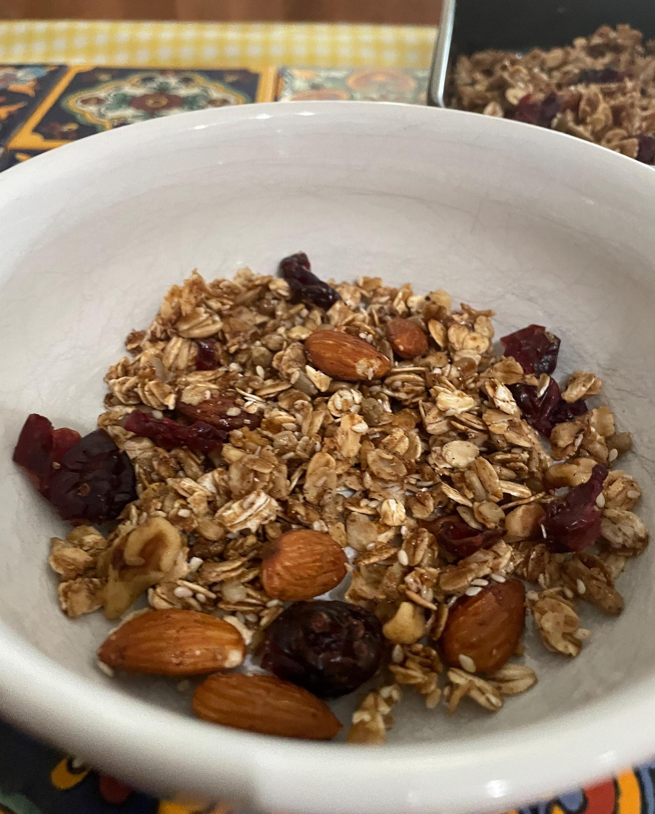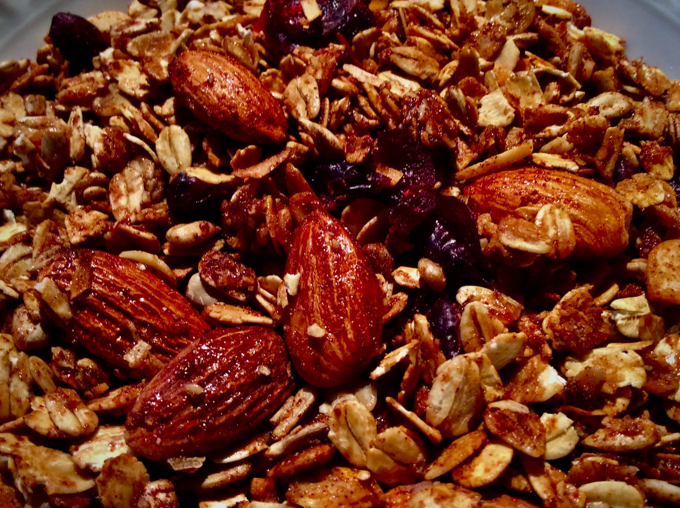 Crunchy granola with a gorgeous, honeyed, warming flavor. Robust almonds, healthy oats and crisp seeds complement the sweet accents from the cranberries. Excellent as a topping on yogurt or milk, if preferred. Can also be enjoyed by the handful on movie night.