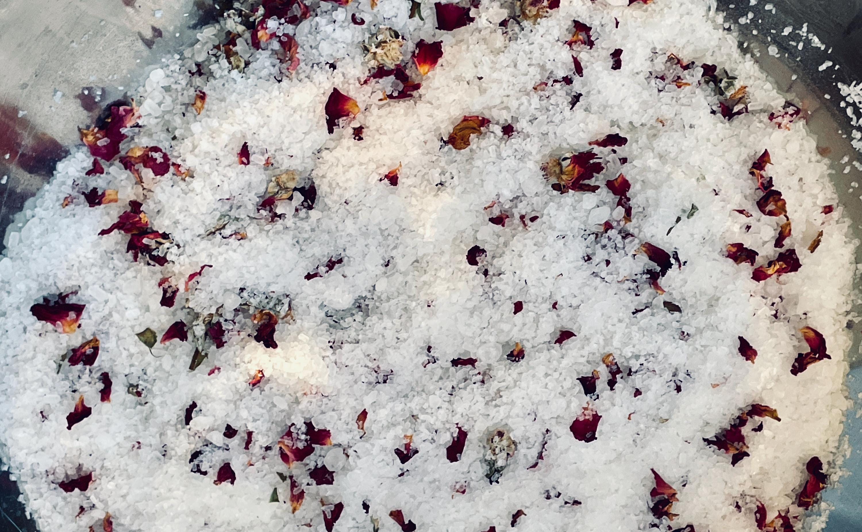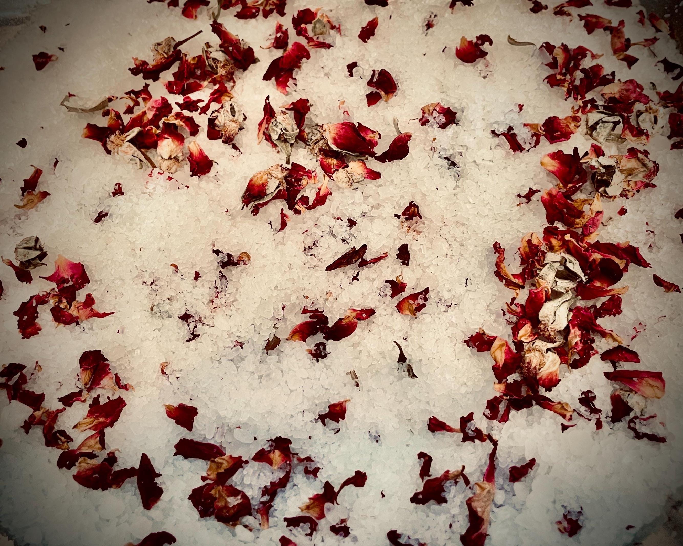 Epsom Salts, Dead Sea Salt, Lavender Essential Oil, Dried Rose Petals, Carrier Oil, Baking Soda